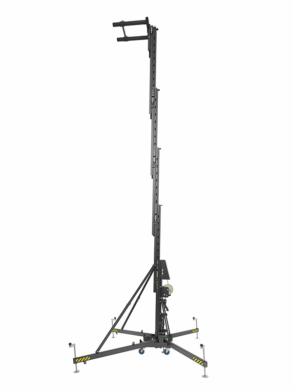 Se incluyen dos soportes laterales telescópicos especiales que, una vez instalados, aportan una estabilidad y resistencia excepcionales al elevador. Los soportes ofrecen dos posiciones diferentes, con una carga máxima de trabajo (SWL) que varía según la posición (véase la ficha técnica), lo que permite al usuario acercarse al cuerpo principal del elevador si es necesario. El elevador se suministra completo con un accesorio AGR-1 y cuatro TA-2 por unidad, fijados al cuerpo para que el usuario disponga de todos los accesorios necesarios para elevar tanto sistemas line array como estructuras de truss.
